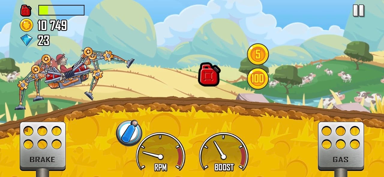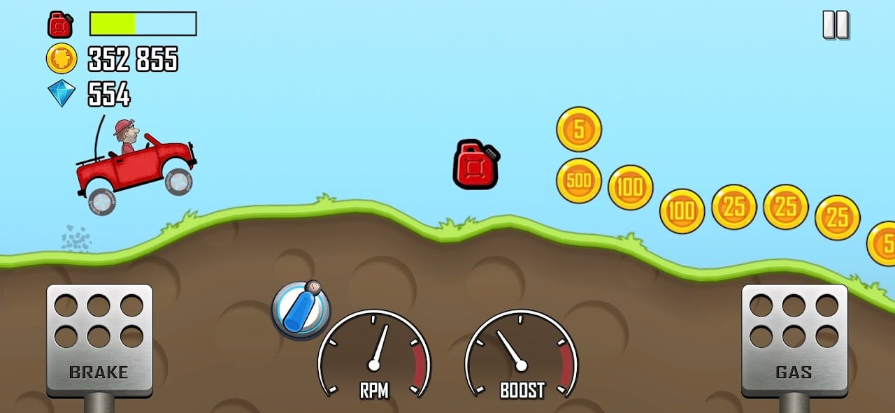 L’obiettivo principale è guidare su percorsi collinari il più lontano possibile, raccogliendo monete e carburante, senza capovolgersi o rimanere senza benzina. L’aspirazione ultima è raggiungere la luna.